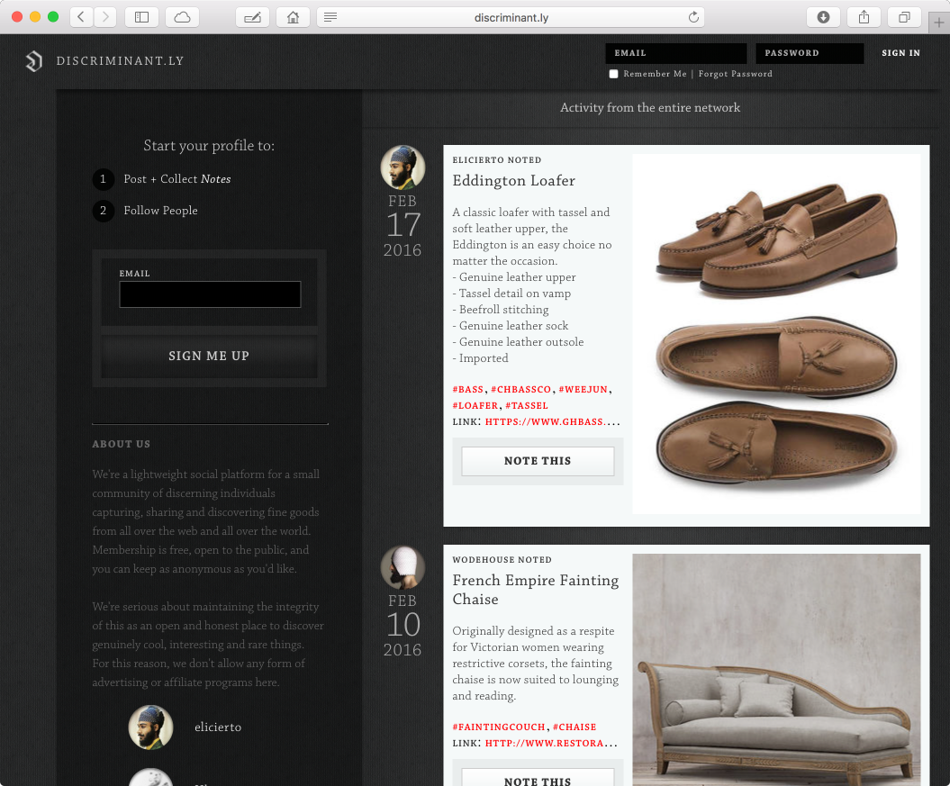 Designed with the singular focus to serve as an elegant social sharing platform to enable its members to collect, share and discover the most interesting fine goods from around the world.