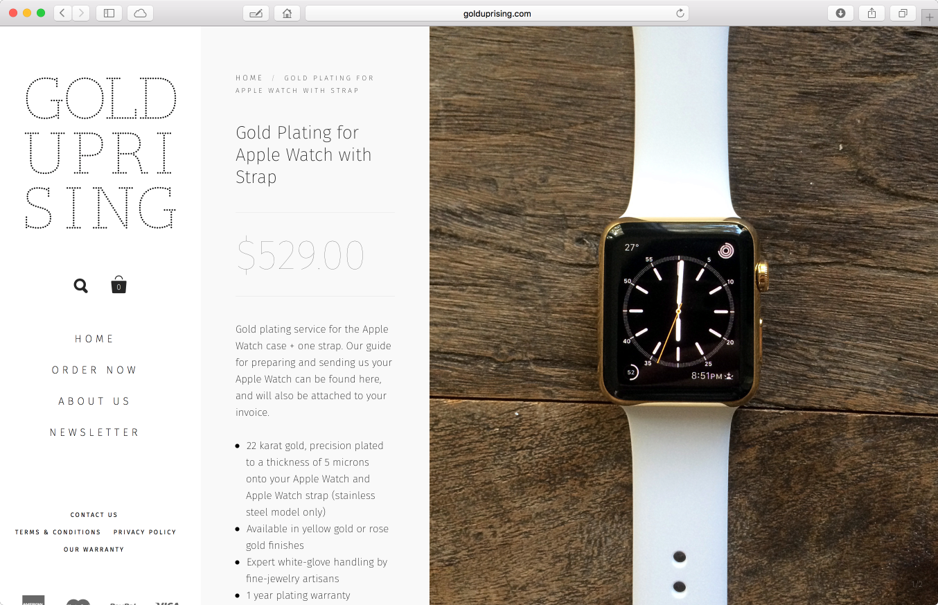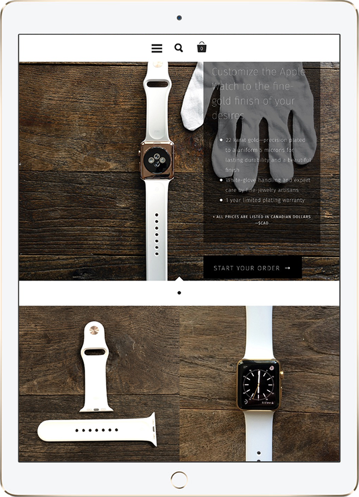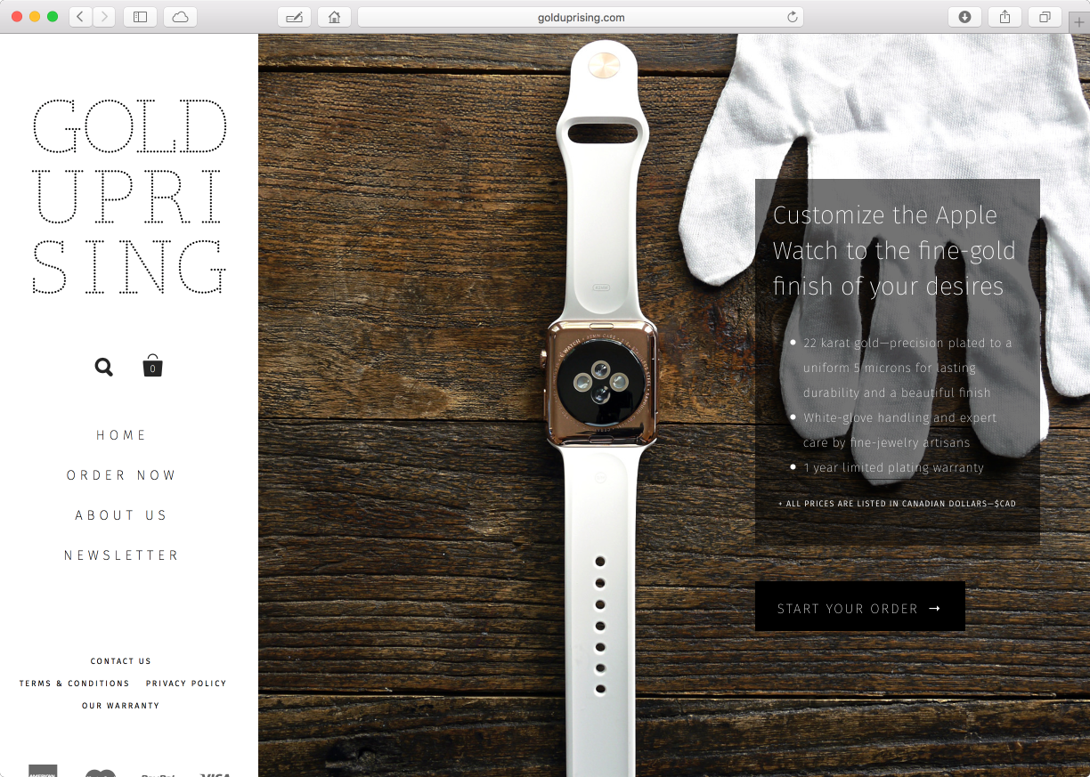 The first gold-plating service for the Apple Watch in Canada. The service can be ordered online only through this desktop and mobile- friendly web experience.