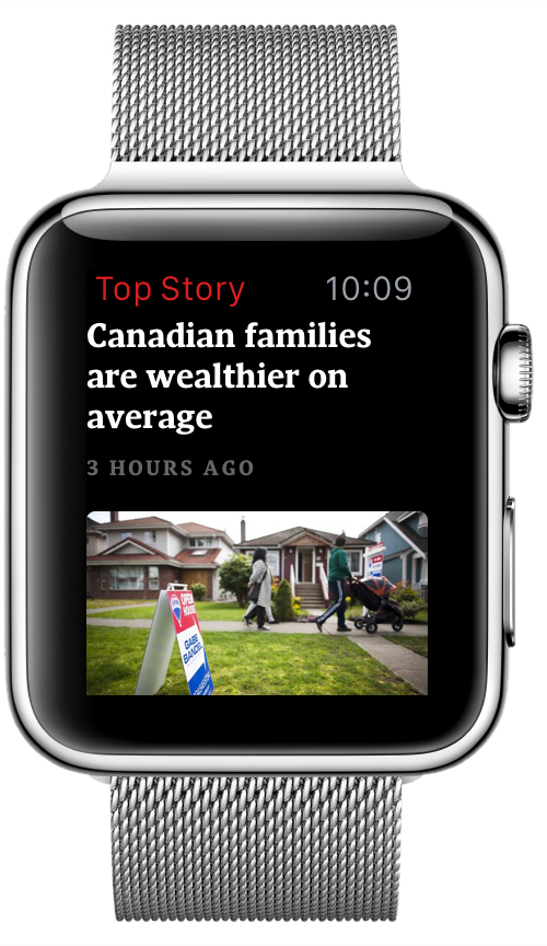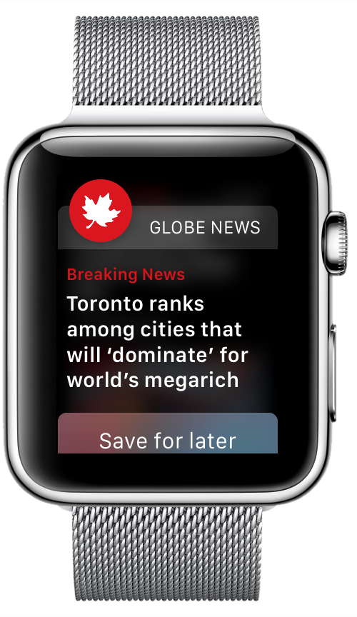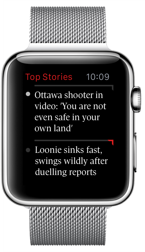 The Globe's first brand expression in the wearables space. Launched as part of the first wave of third-party apps--and one of the first news apps--for the Apple Watch. The watch app experience is an extension of The Globe and Mail's iOS app on the iPhone. Top Stories headlines as well as article previews for those headlines are available on the Watch. From the article previews, the user can open and read those articles on their iPhones seamlessly using handoff.
