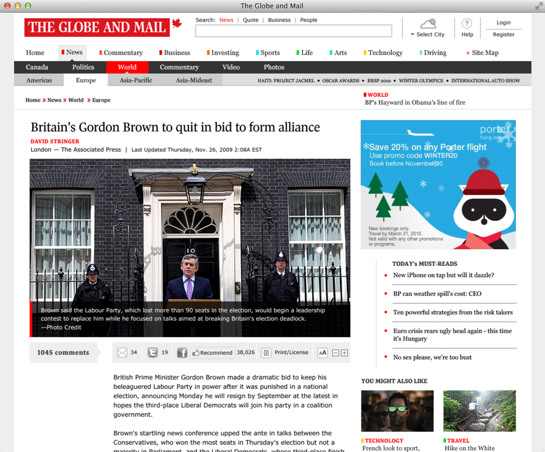 This redesign successfully helped increase the Canadian media company's user-engagement metrics with page-views increasing by 31% (+ 32 million/month)and visits an additional 10.5% (+ 2.7 million/month) accounting as the peak of the The Globe and Mail's web traffic to-date.